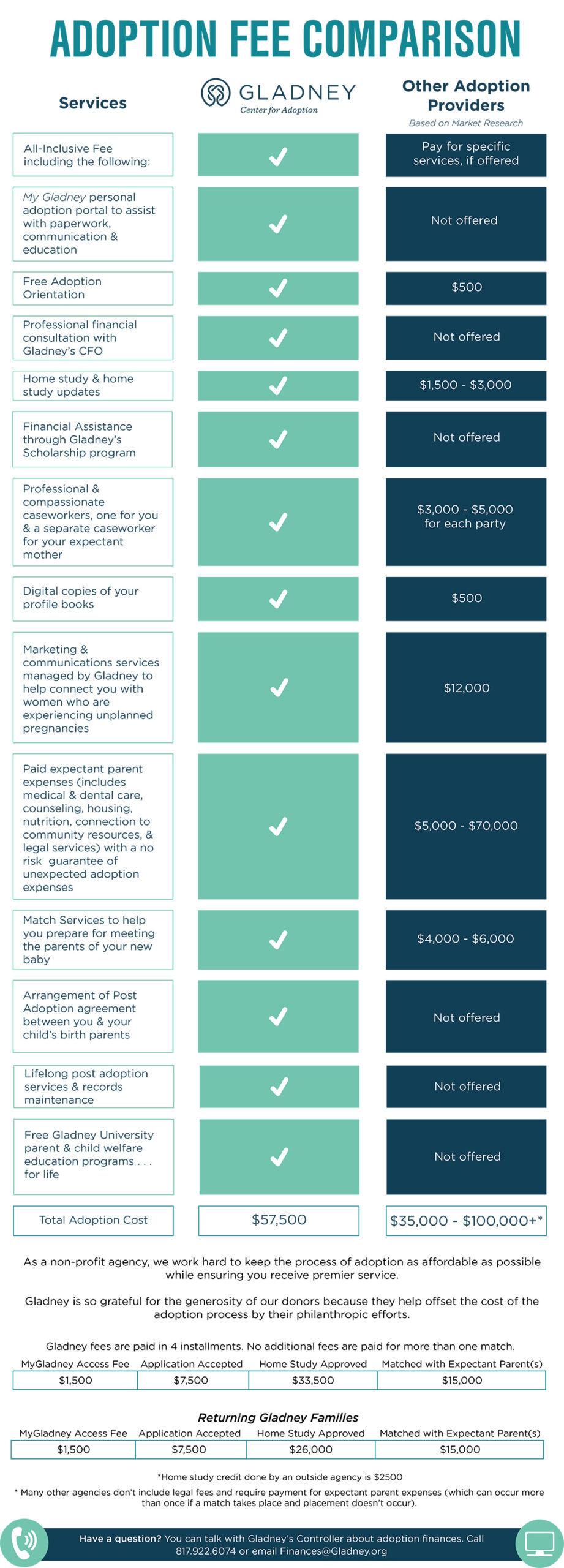 The Gladney Center for Adoption is excited to announce a new all-inclusive fee schedule and scholarship program dedicated to ensuring the cost of adoption is not a barrier to your dream of becoming parents. As a non-profit agency, we work hard to keep the process of adoption as affordable as possible while ensuring you receive premier service.